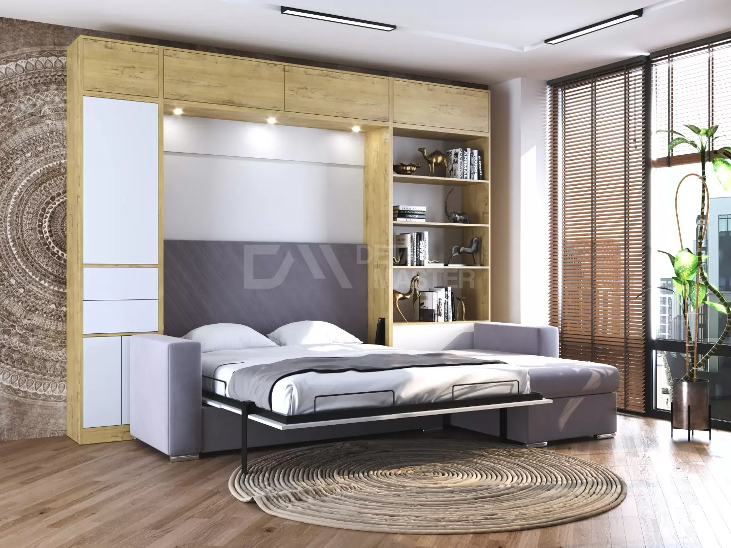 Шкаф-кровать трансформер с диваном "Big Family Balance"работает на механизме раскладывания собственной разработки "Balance". Кровать раскладывается легким движением руки, превращаясь в полноценное спальное место. Просто потяните за ножку-маятник, которая самостоятельно фиксируется в нужное положение при опускании.